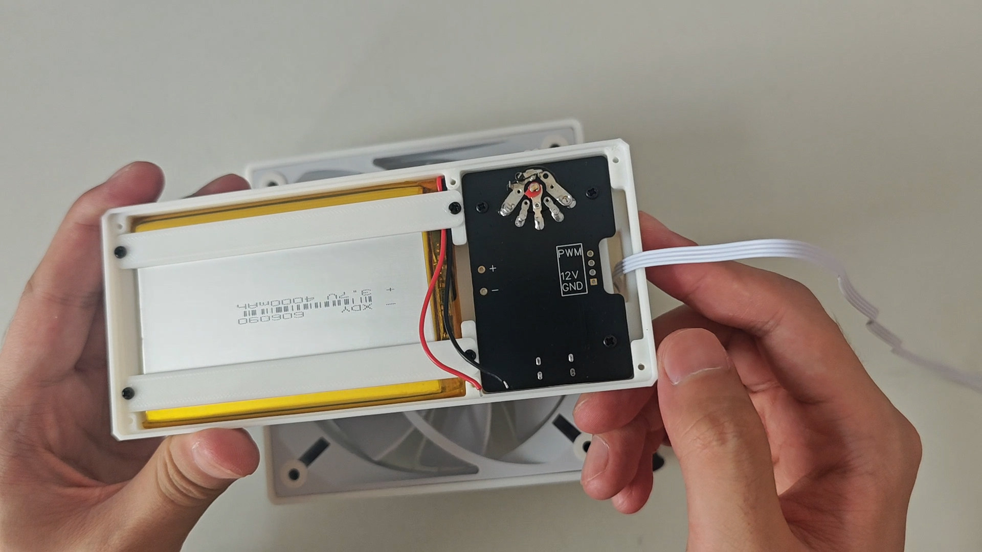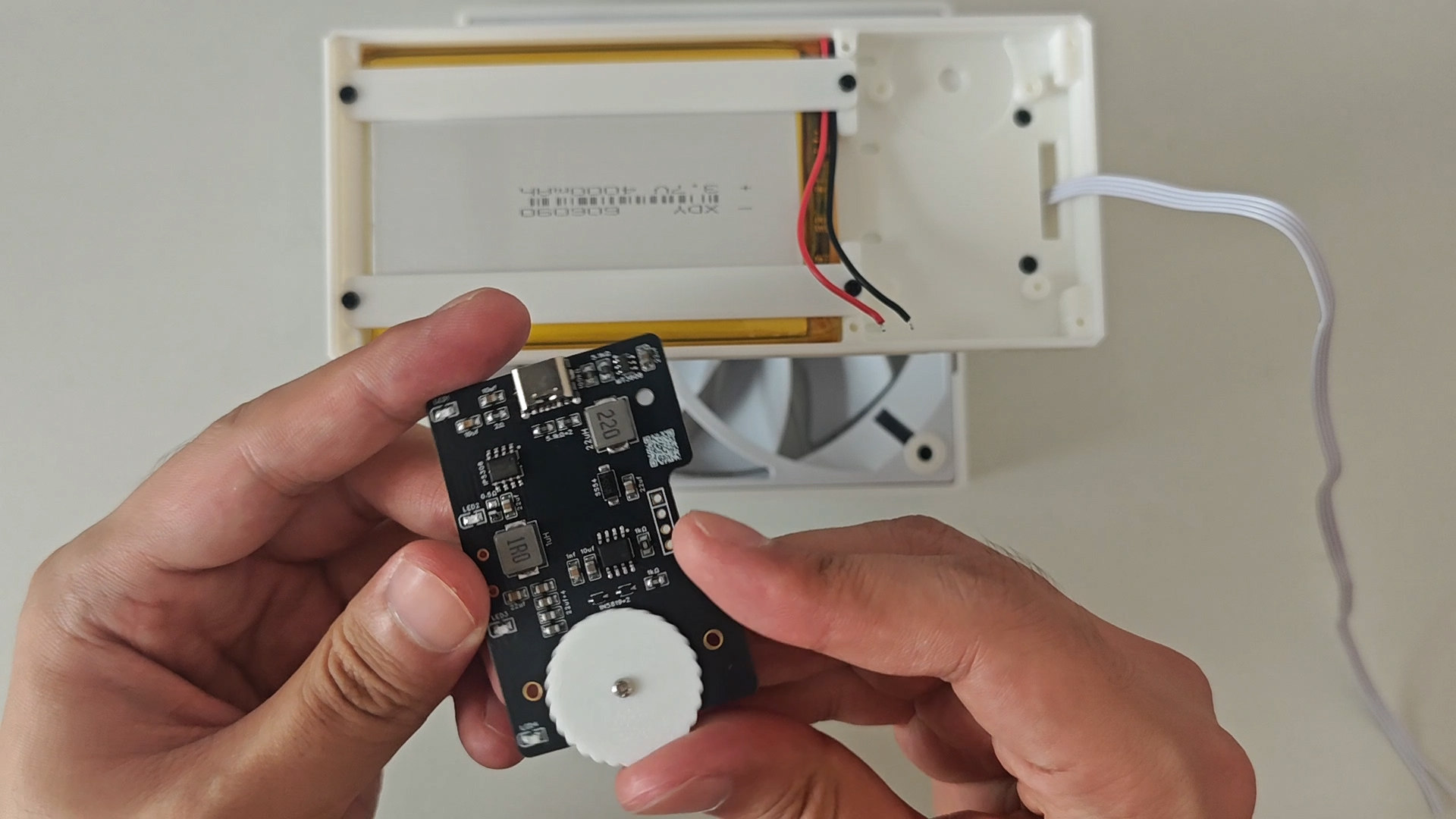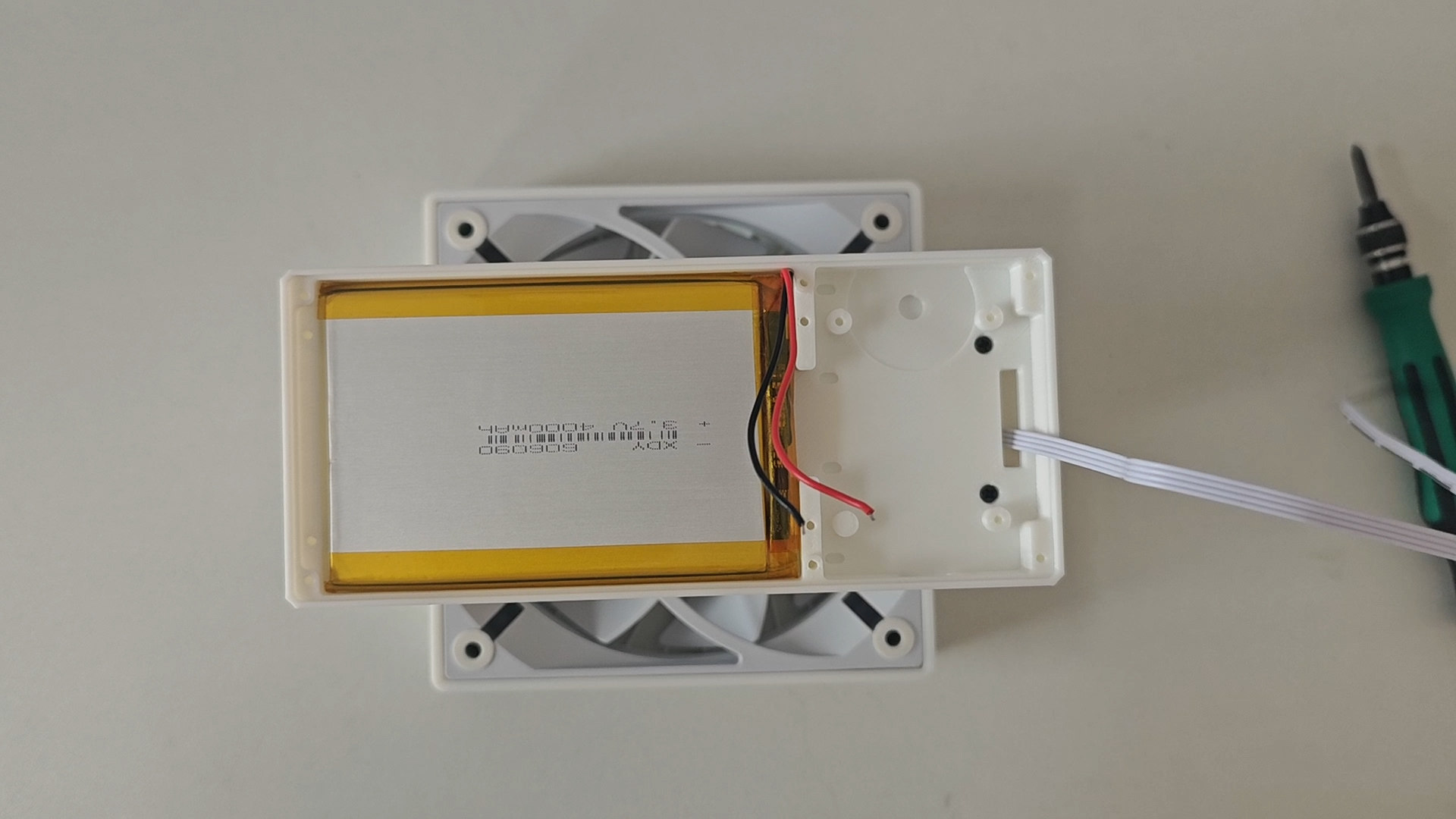 支持180度大角度俯仰调节;可以适配猫头鹰开源的导流罩使用。控制部分用的是一个自带开关的收音机电位器,左右转动转盘就可以调节风扇转速,十分方便。供电用的是一块4000mah的大电池,不用担心续航问题,还有4颗LED可以显示电池电量,后面还有Type-C接口可以充电。