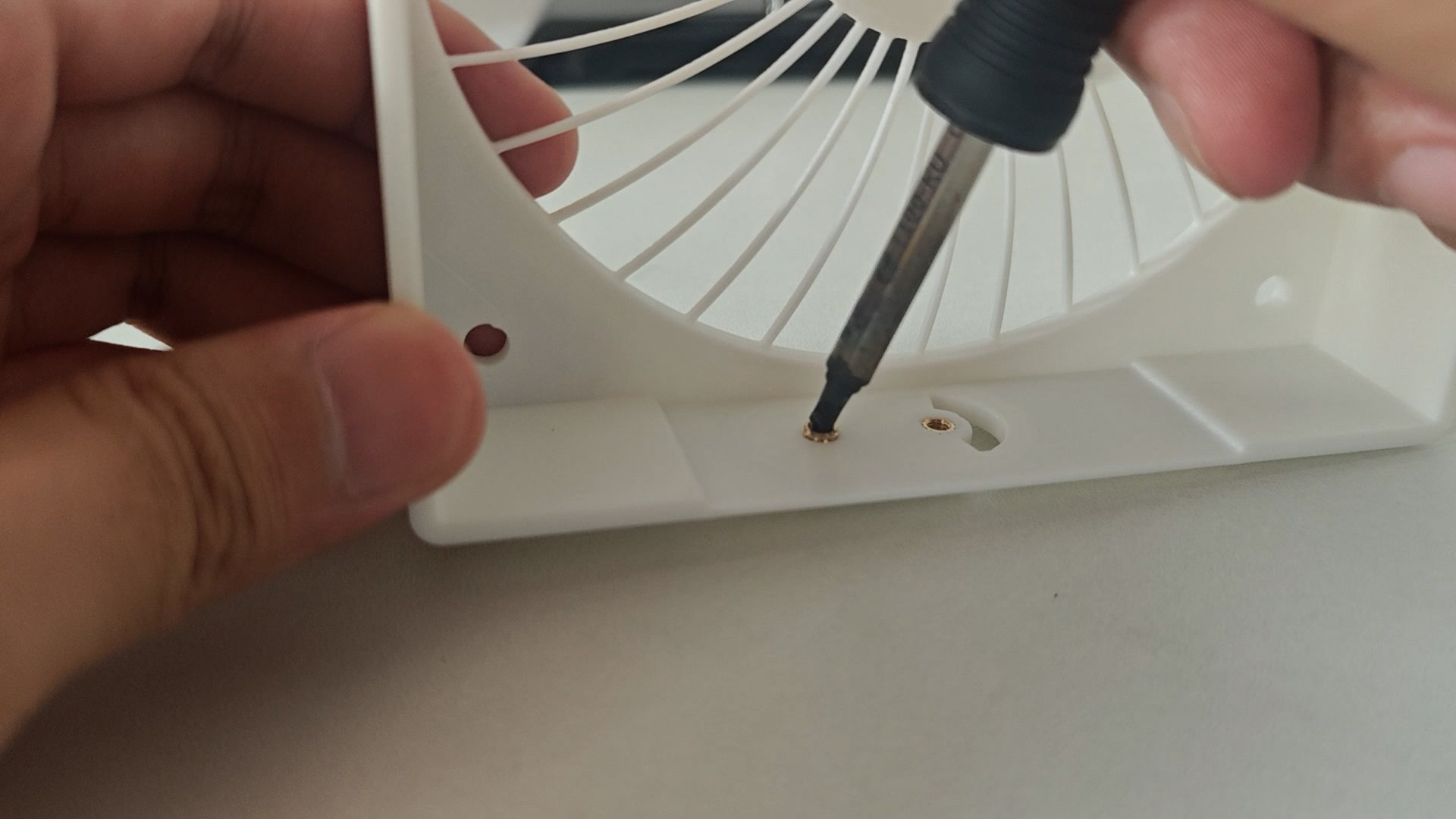 所需材料都准备好之后就可以进行组装了,首先需要先在风扇框架中埋入4颗热熔螺母,建议从框架内向外部植入。