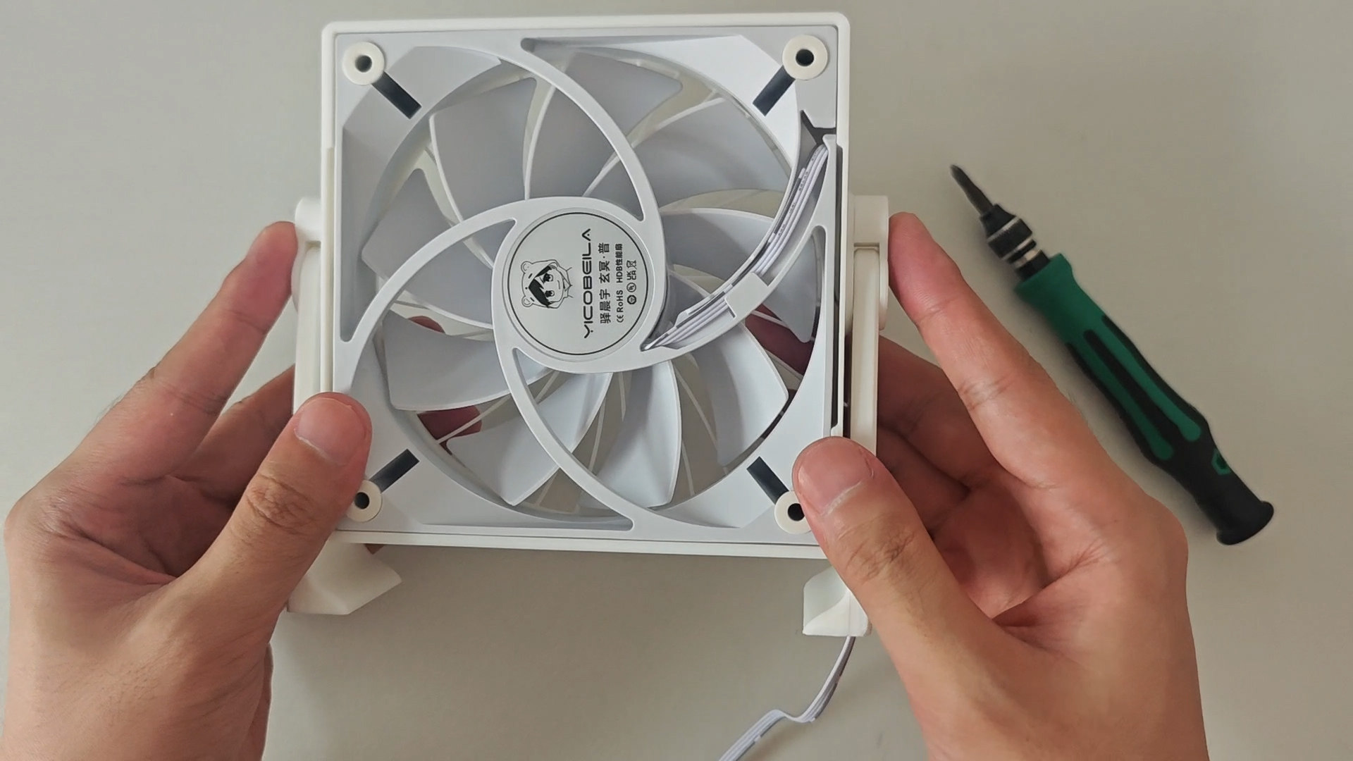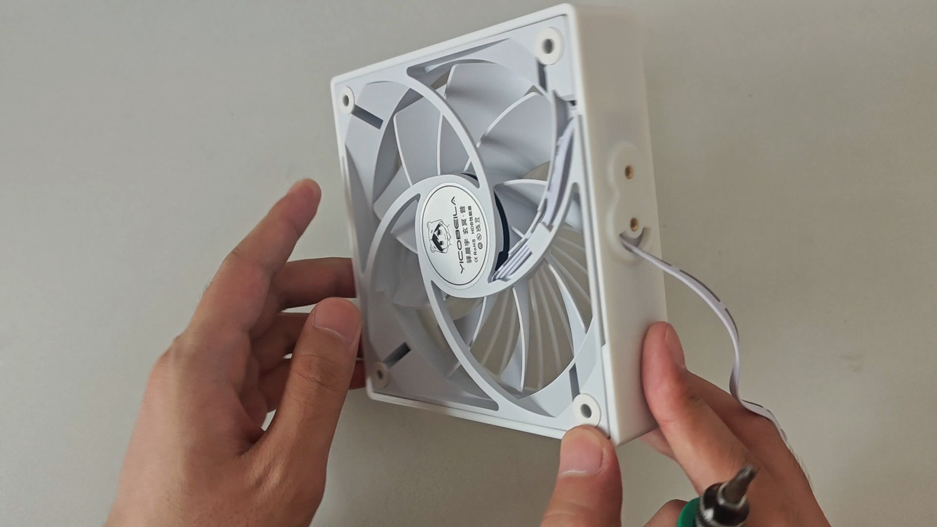下面开始安装风扇,先把框架摆正,保证扇形环缺口在下面,一般来说机箱风扇的出风面是有框架的一面,注意不要装反了,然后把线从右侧的扇形环缺口处穿出即可,注意一定是右侧。