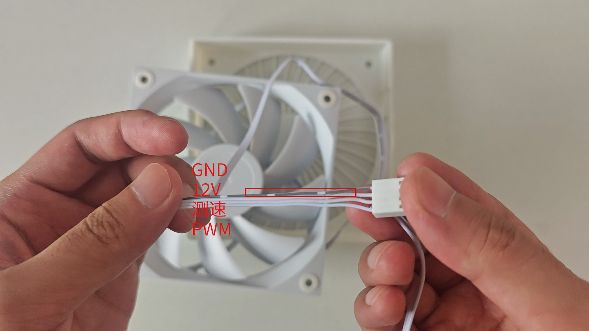 然后安装风扇,因为使用的是PWM调速,所以风扇必须是四线风扇才行。风扇线序及定义如图所示,从上到下分别是GND、12V、测速、PWM控制。